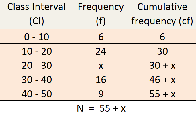 The form of this table is very simple because it only presents the number of observations or frequencies in each class interval. X f cf 0-10 10-30 30-60 60-80 80-90 5 12 28 10 5 5 17 45 55 60 Total Σ P 60 The value of 30th item lies in 30-60 class interval.